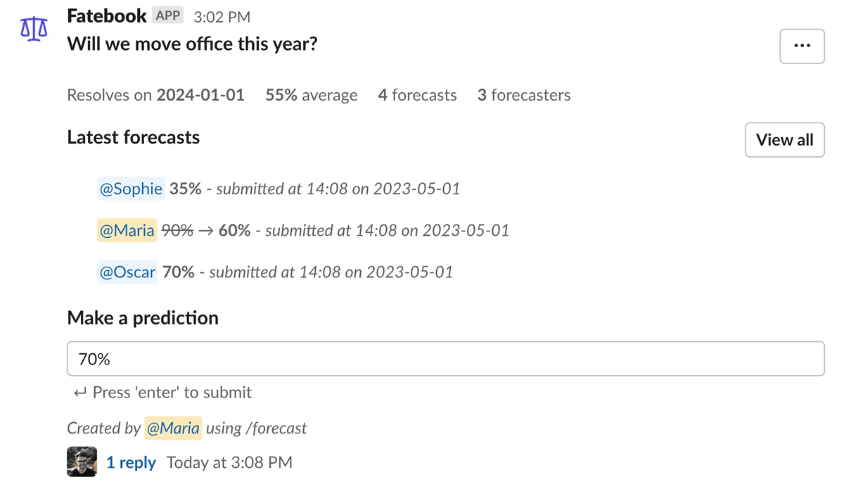 Fatebook.io lets you make rapid predictions on the web, or you can use Fatebook for Discord. Suggest a Fatebook integration for another platform.